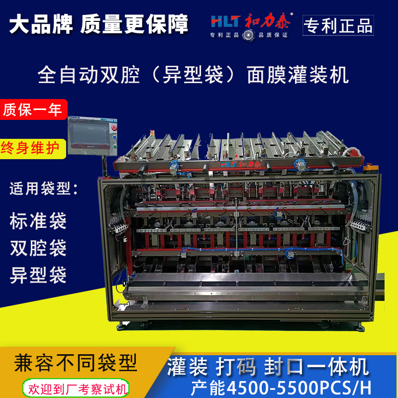 和力泰立式雙腔異型袋面膜灌裝壓碼打碼封口一體機(jī)