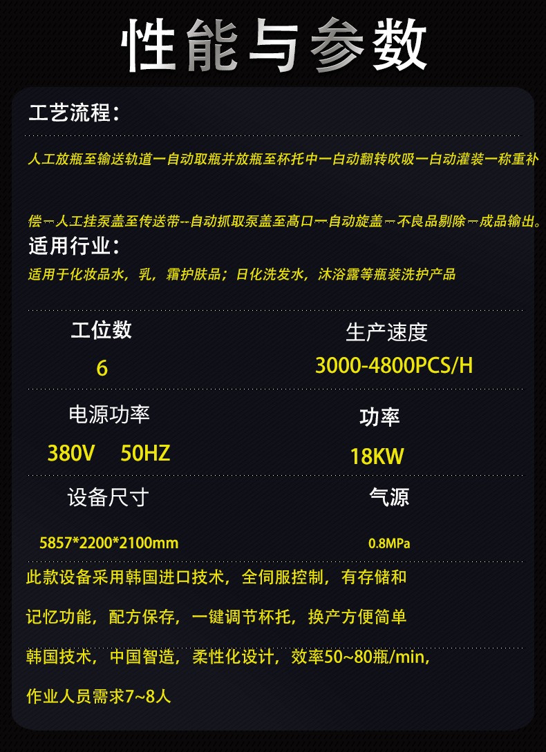 ③ 灌裝量:100-1000mL,灌裝精度:±0.5%,最大粘度:20000CPS